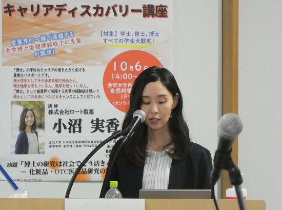 10月6日,金沢大学博士研究人材支援・研究力強化戦略プロジェクト(HaKaSe+)と学務部キャリア支援室は,「KU博士キャリアセッション2025の第3弾としてキャリアディスカバリー講座 小沼実香博士講演会「博士の研究は社会でどう活きるか―化粧品・OTC医薬品研究の現場から」を開催し,対面会場・オンライン配信合わせて約120名が参加しました。