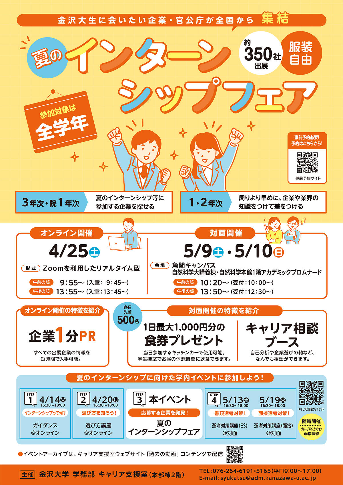 キャリア支援室では、「夏のインターンシップフェア」を、4/25(土)【オンライン】、5/9(土)~10(日)【対面】で開催します!