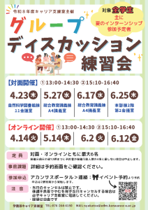 キャリア支援室では、4~7月に夏のインターンシップ参加対策として「グループディスカッション練習会【対面・Web】」を開催します。