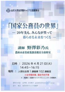 キャリア支援室では、4月21日(火)の4限目に現職の国家公務員・野澤彩乃さんによる特別講演会「国家公務員の世界 – 20年先も、みんなが笑って暮らせる未来をつくる -」を開催します。